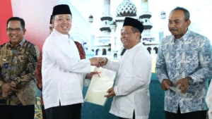 Menteri ATR/Kepala BPN Nusron Wahid, bersama Gubernur Jawa Timur, Khofifah Indar Parawansa, menyerahkan 2.532 sertipikat tanah wakaf dan rumah ibadah di Masjid Nasional Al-Akbar Surabaya, Sabtu (13/12/2025). Surabaya – Menteri Agraria dan Tata Ruang/Kepala Badan Pertanahan Nasional (ATR/BPN), Nusron Wahid, bersama Gubernur Jawa Timur, Khofifah Indar Parawansa, menyerahkan sebanyak 2.532 sertipikat tanah wakaf dan rumah